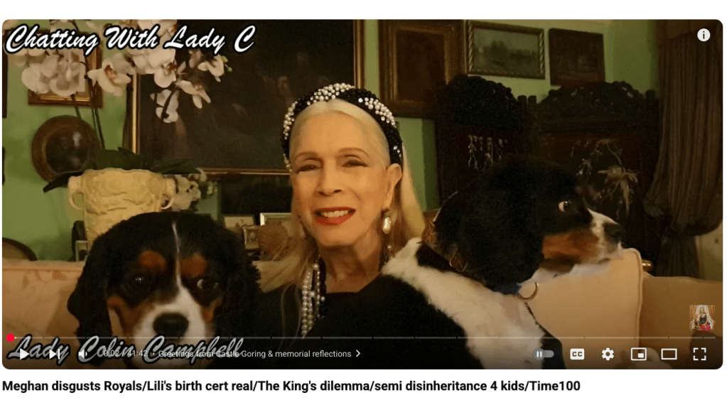 From Castle Goring this week, Lady Colin Campbell delivered another blistering commentary on Meghan Markle. Ostensibly reflecting on the memorial of legal titan Michael Reynolds and a theater night out, the video quickly turned into an unfiltered monologue against the Duchess of Sussex. The pretext? A photograph Meghan posted that Lady C claims is proof of exhibitionism and deception.