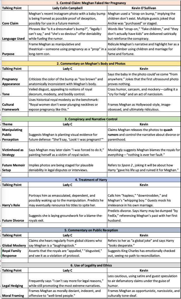 The accusations escalate. Lady C implies that Meghan and Harry’s children might not be real. She claims their birth certificates are suspicious, that the pregnancy bumps look “too brown,” and that their obstetrician vanished from public view. She weaves these into a theory of narcissistic performance: Meghan allegedly posts such images to bait the royals, manipulate King Charles, and ensure she can frame herself as a victim if the relationship collapses.