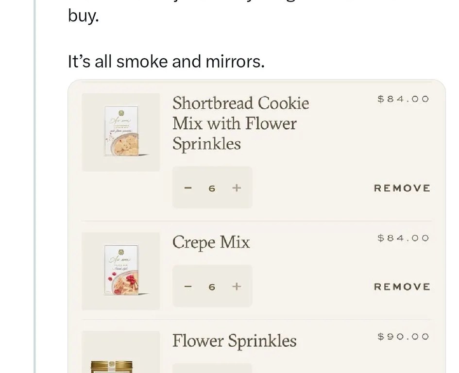 In the tweet, “Salty Duchess” proudly claims to have added six of each available product to her cart and then left it there “with zero intentions of paying,” believing this action would somehow sabotage Meghan’s business. The screenshot reveals only three products: shortbread cookie mix, crepe mix, and flower sprinkles—each priced between $84 and $90. The tweet attempts to imply that the store is lacking inventory and falsely advertises variety. It ends with the smug conclusion: “It’s all smoke and mirrors.”