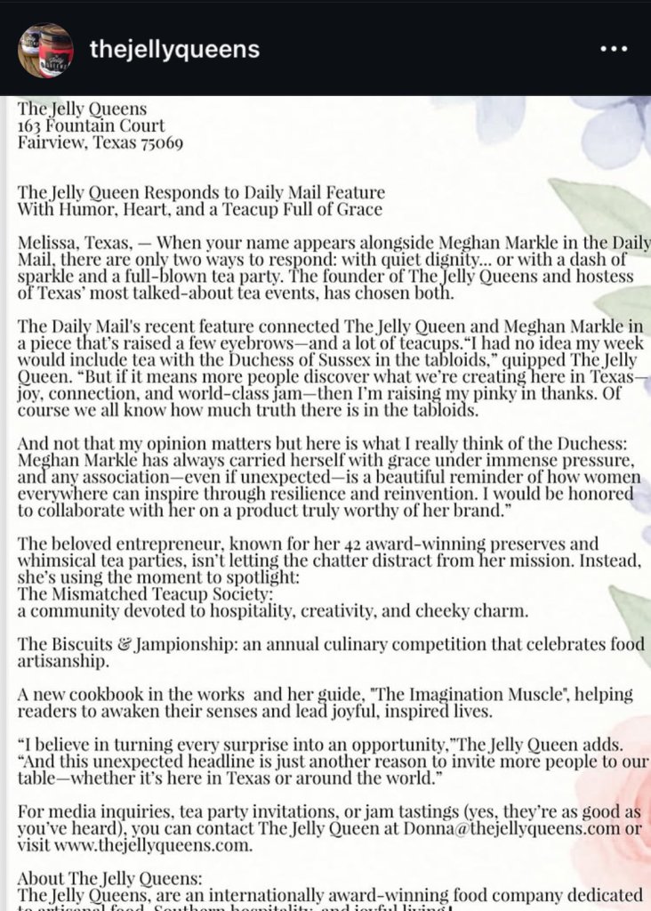 When brand strategy meets backlash, the result is usually a notes app apology — or in this case, a teacup-shaped clarification. On June 22, The Jelly Queen issued a “Royal Clarification” insisting she has never criticized Meghan Markle and accusing the media of twisting her words into clickbait. But here’s the sticky part: her original post was full of carefully choreographed praise, yes — but also unmistakably eager self-insertion into Meghan’s narrative, timed for maximum visibility.