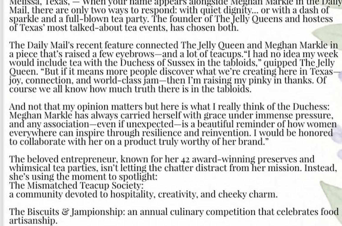 Let’s not pretend this was a tabloid trap. No one forced The Jelly Queen to lean into her association with Meghan Markle, quote herself in pinky-raising gratitude, or promote her Mismatched Teacup Society while indirectly basking in the glow (and controversy) of one of the most polarizing figures in modern royal media. She did that willingly.