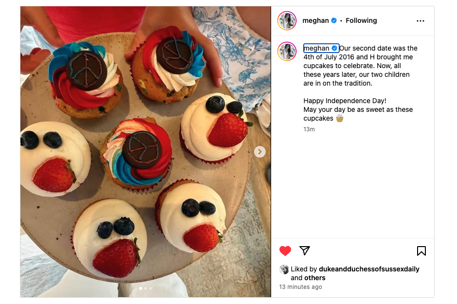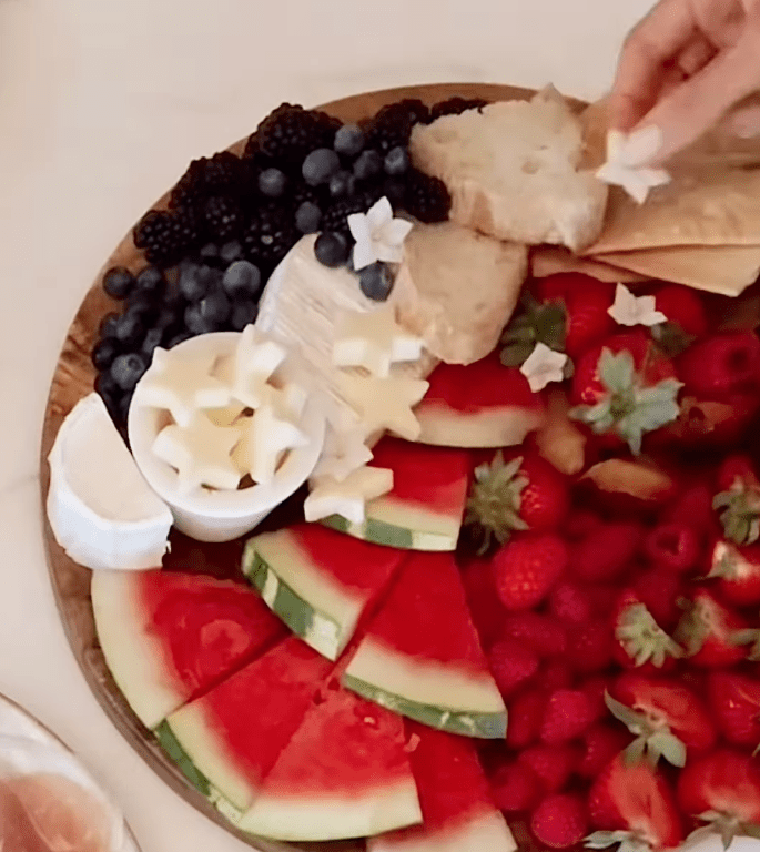 No matter what Meghan does, she is criticized. The cute July 4, 2025 platter is no different. She is wearing a blue and white shirt as the American flag has stripes, she has red, blue, and a pretty star cut fruit. It is a simple idea and yet they are furious, perhaps that they didn’t come up with the idea. So what exactly was so offensive about a fruit platter?