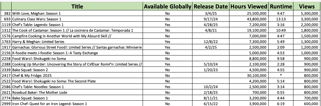 Netflix’s January-June 2025 engagement report shows “With Love, Meghan” ranked #383 overall with 5.3 million views. Within actual cooking programming, it was #1:
