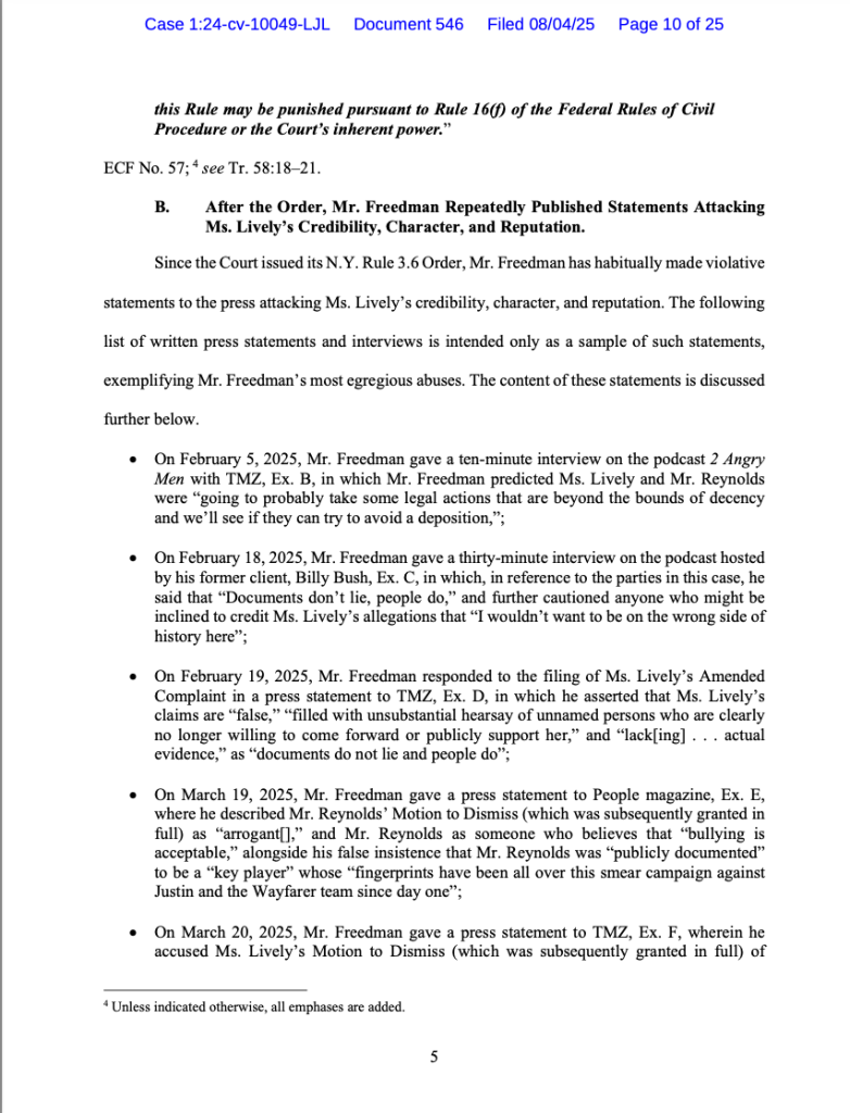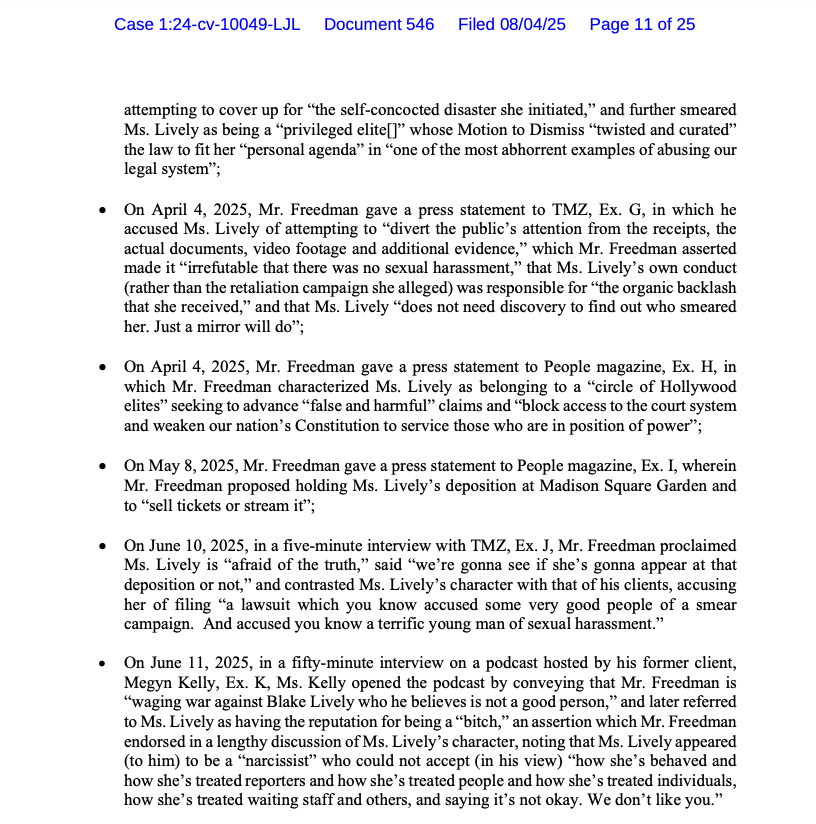 In a sharply worded motion filed August 4, 2025, Blake Lively’s legal team asked the Southern District of New York to impose sanctions against celebrity attorney Bryan Freedman and the Wayfarer Defendants, accusing them of brazenly violating a court order that restricted public commentary on the high-profile defamation case. The motion, now public as Dkt. 546, alleges that Freedman deliberately undermined the Court’s gag order by engaging in a coordinated media campaign to discredit Lively and influence public opinion—behavior the filing calls “deliberate, strategic, and contemptuous.”