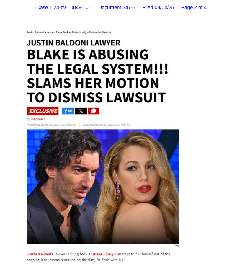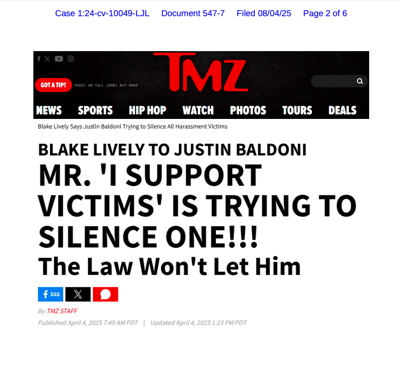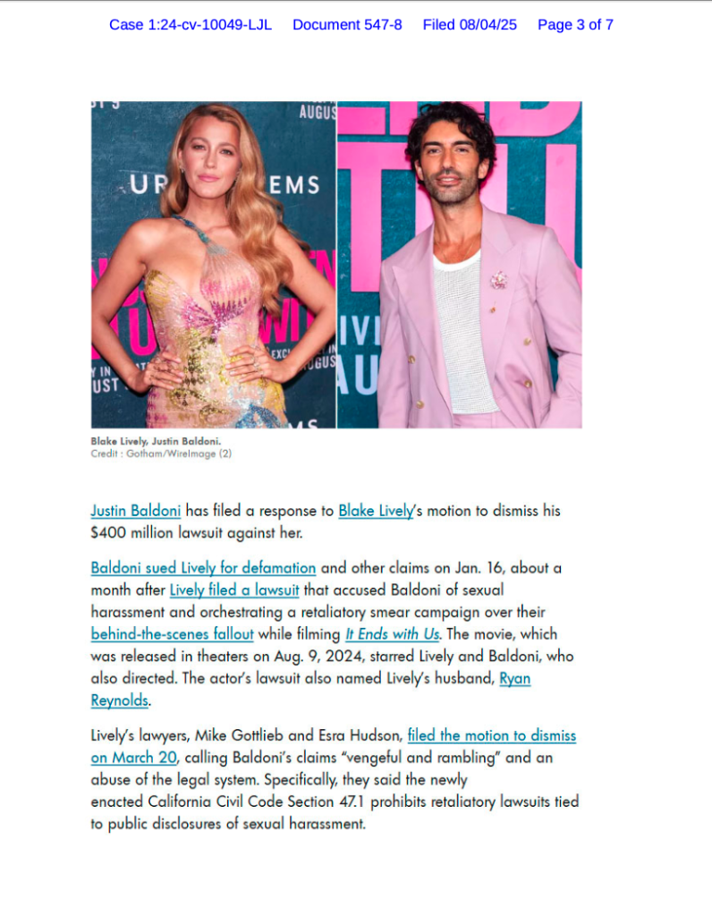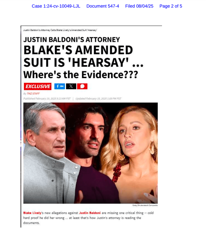 Exhibit B (Doc. 547-2) in support of Blake Lively’s motion for sanctions, now serves as a potential smoking gun in her legal team’s efforts to hold opposing counsel accountable for violating a court-imposed gag order.