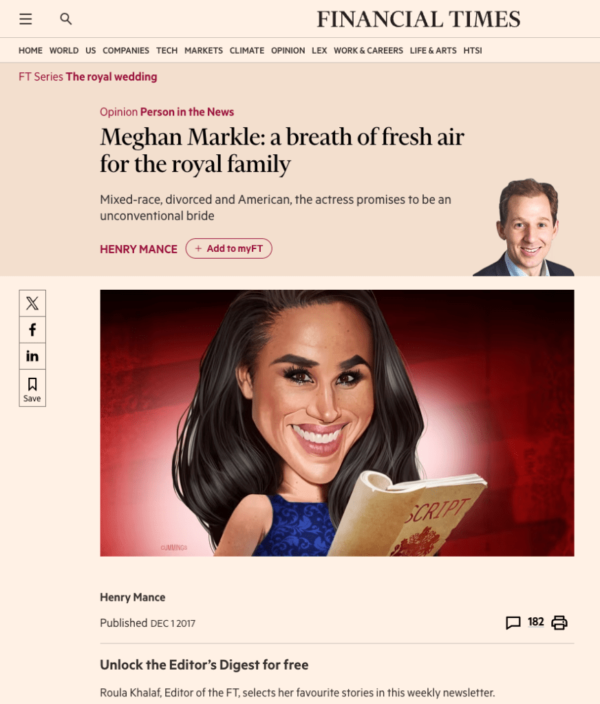 In the winter of 2017, the British monarchy was bracing for transition. Queen Elizabeth II had been unwell the previous Christmas, Prince Philip had retired from public duties, and the talk in the press was about the institution’s aging face. Then came the announcement that Prince Harry would marry Meghan Markle, a 36-year-old American actress whose background and public activism promised something entirely new. The Financial Times dubbed her “a breath of fresh air for the royal family,” likening her intrigue to Diana Spencer and Wallis Simpson but without the scandal.