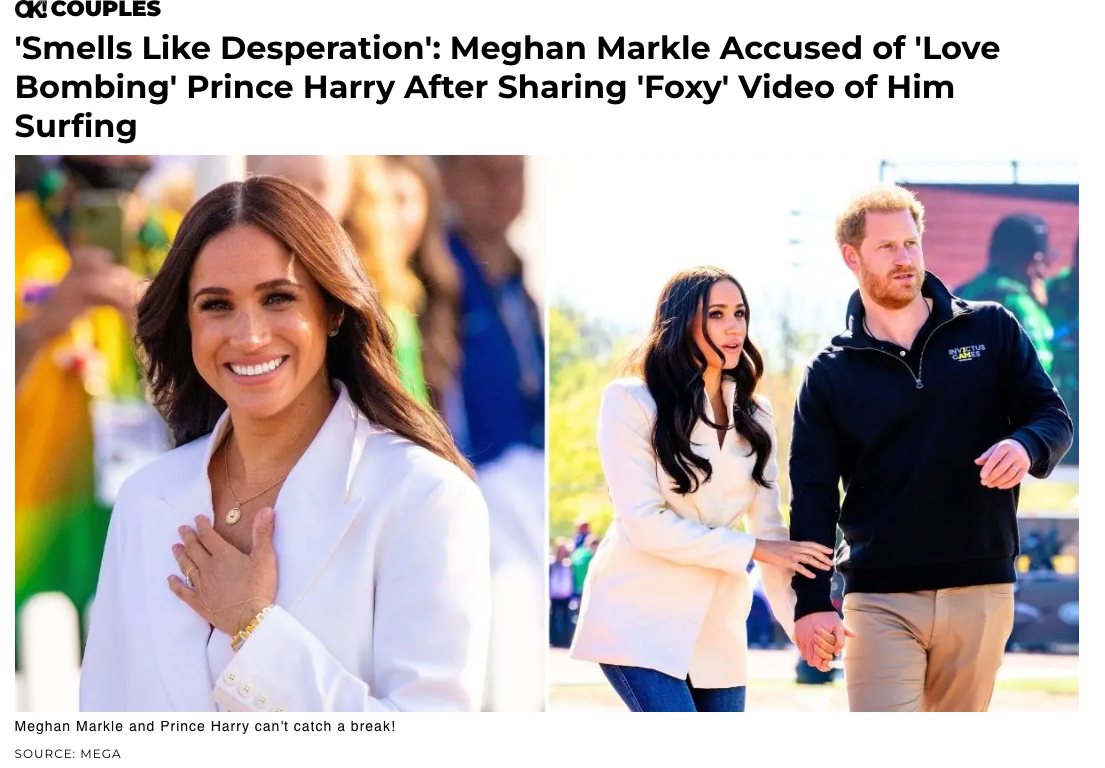 The recent criticism over Meghan’s surfing video of Prince Harry perfectly illustrates this pattern. What would be seen as playful affection from other spouses gets filtered through a lens of suspicion – suddenly it’s “desperate,” “cringe,” or evidence of manipulation rather than simple marital pride.