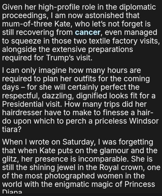 Platell’s earlier digs, such as Kate spending “hours planning outfits” or “finessing a tiara at the hairdresser,” read like satire. Her sudden apology sounded less like heartfelt remorse and more like palace-enforced damage control. To many, this was not an apology but royal bootlicking dressed as regret, the kind of pivot that follows a furious phone call from Kensington Palace.