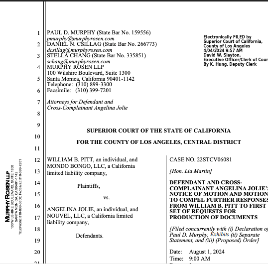 On December 17, 2025, the Los Angeles Superior Court granted, as modified, Pitt’s motion to compel compliance with prior discovery responses. The order requires Jolie to produce a limited set of previously redacted, non-attorney communications identified on a privilege log. The court did not pierce attorney-client privilege, did not rule on the merits of the case, and did not endorse Pitt’s version of events. It was a procedural discovery ruling, not a judgment on truth or liability.
