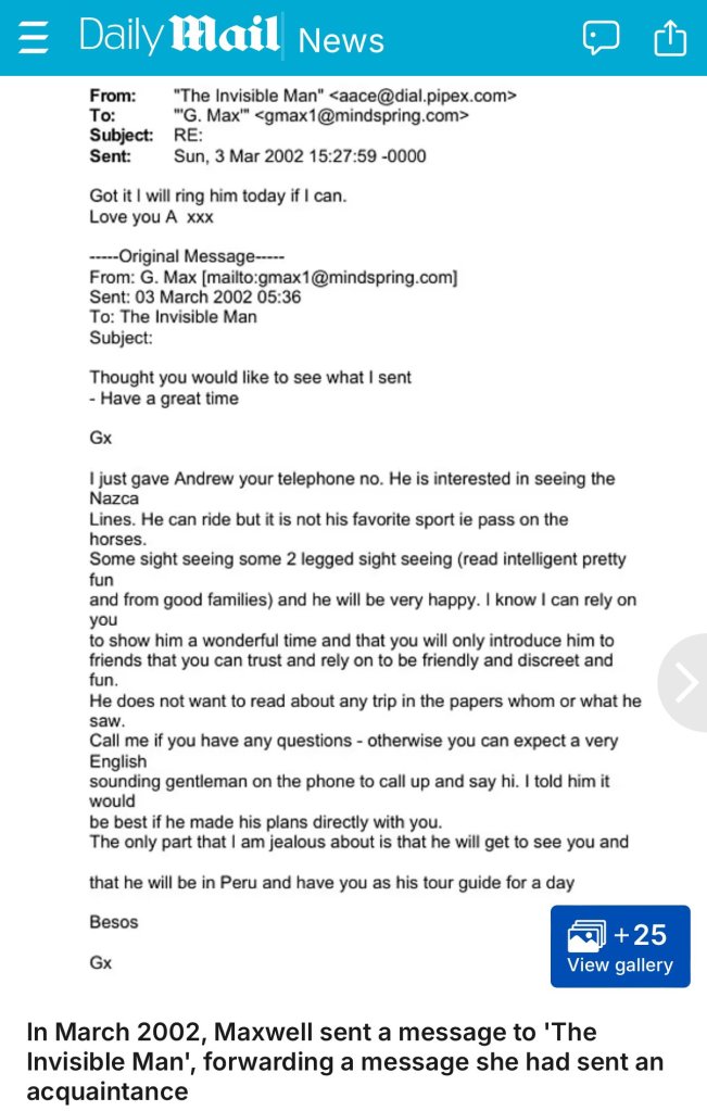 - A 2001 email sent from Balmoral, signed “A xxx,” asking Ghislaine Maxwell about “new inappropriate friends”