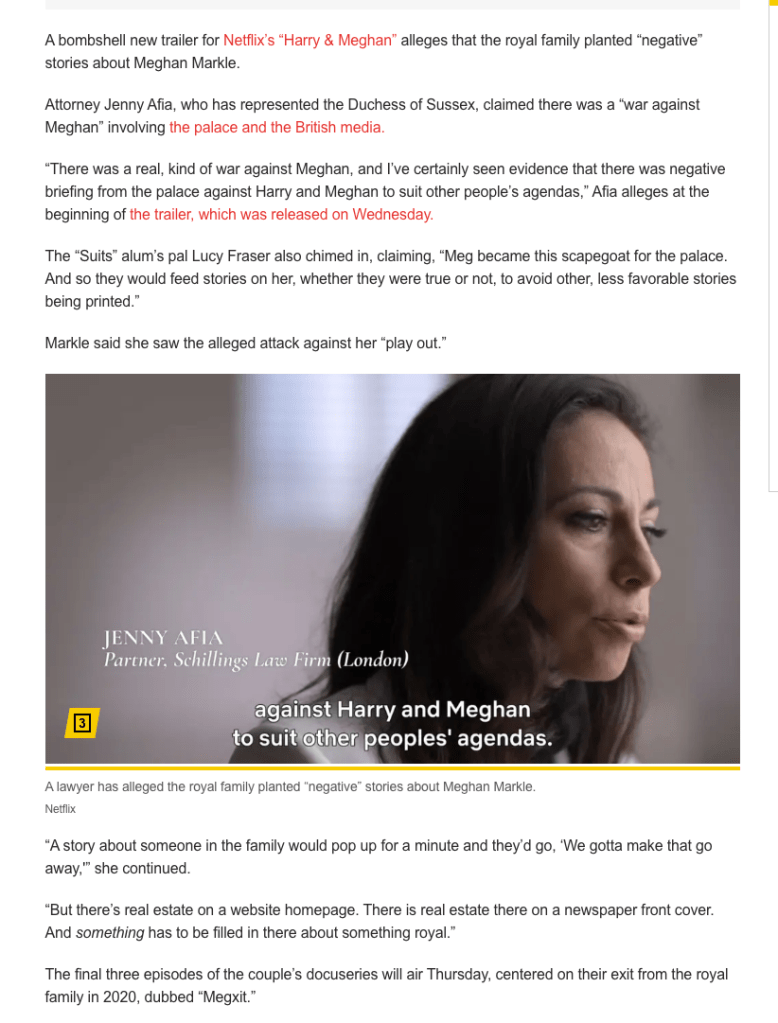 Attorney Jenny Afia, who represented Meghan, stated on camera: “I’ve certainly seen evidence that there was negative briefing from the palace against Harry and Meghan to suit other people’s agendas.”
