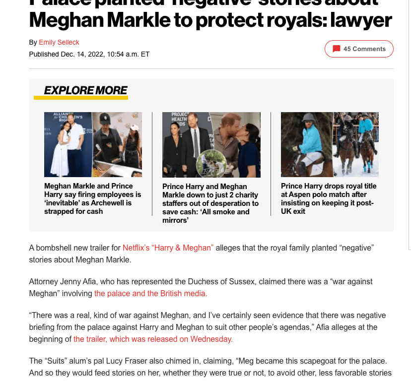 Attorney Jenny Afia, who represented Meghan, stated on camera: “I’ve certainly seen evidence that there was negative briefing from the palace against Harry and Meghan to suit other people’s agendas.”