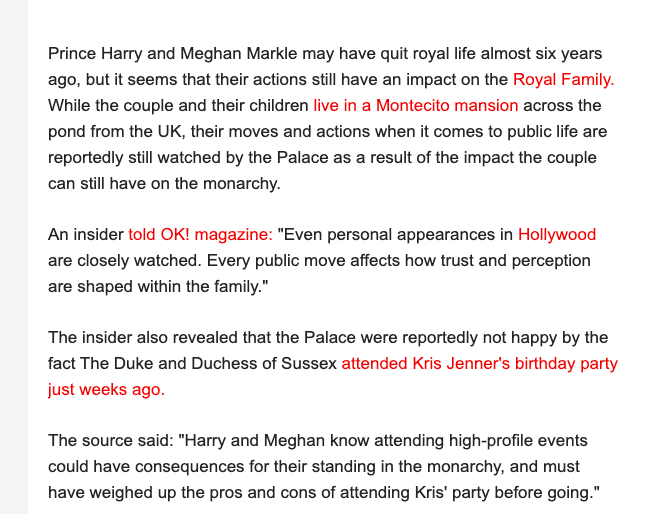 The piece reveals the Palace was “reportedly not happy” about Harry and Meghan attending Kris Jenner’s birthday party. Let’s examine what this framing accomplishes: