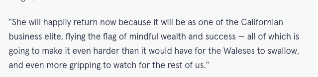 Watson is saying, essentially, that Meghan was supposed to come back humiliated. The cancelled Spotify deal, the scaled back Netflix deal, the alleged American backlash. These were supposed to be her punishment. She was supposed to return diminished.