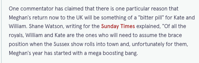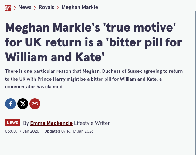 The Sunday Times commentator Shane Watson wrote that Meghan’s success would be a “bitter pill” for William and Kate to swallow. The Daily Mirror amplified this framing, running a headline about the “true motive” behind Meghan’s planned UK return and why it would be so hard for the Waleses to accept.
