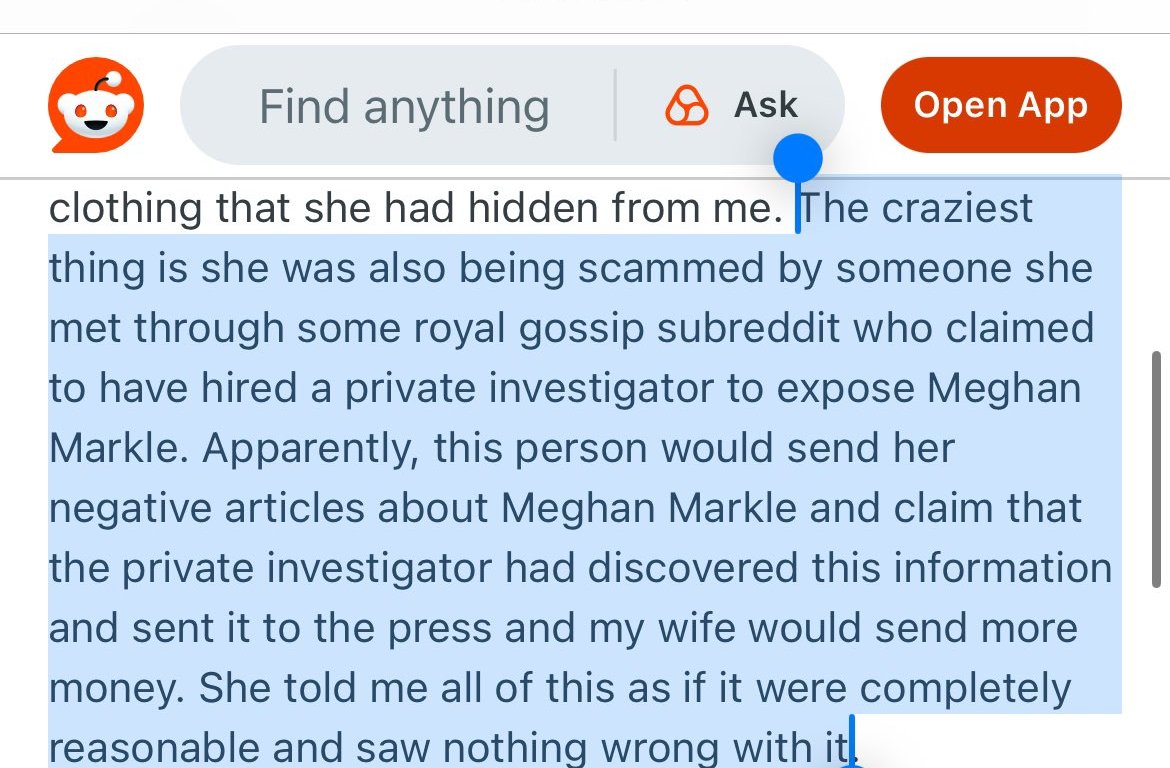 The most chilling detail appears almost casually in the update and is now circulating in screenshots: the wife had been sending money to a stranger she met through a royal gossip subreddit. This person claimed to have hired a private investigator to “expose” Meghan Markle, forwarding negative articles and insisting the information had been passed to the press. Each message prompted more payments. When confronted, she described the entire arrangement as completely reasonable.