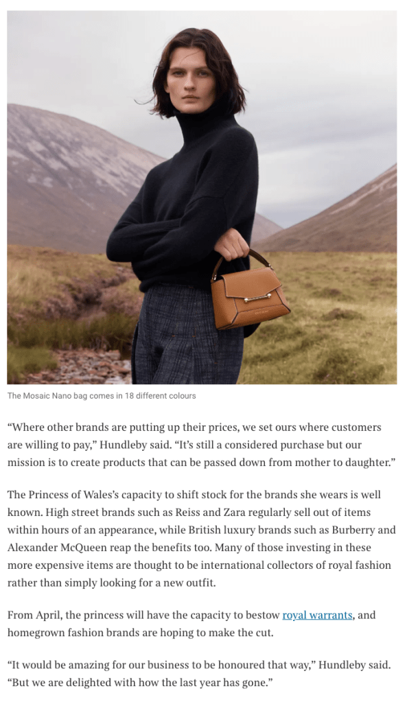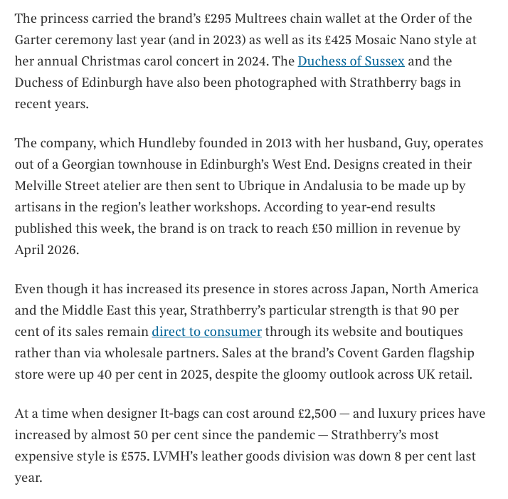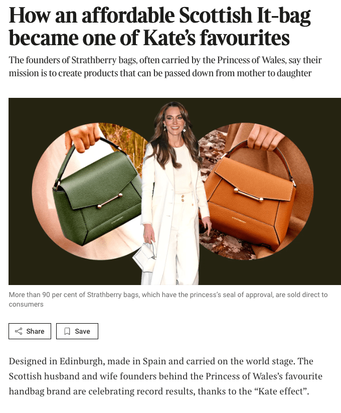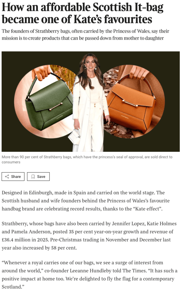 When The Times published its glowing profile of Scottish handbag brand Strathberry on January 30, 2026, the headline told readers everything they were supposed to believe: an affordable Scottish It-bag had become “one of Kate’s favourites,” driving the company to record revenue of £36.4 million through the power of the “Kate effect.”