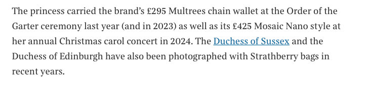 Compare that framing to how the article discusses Kate: “The princess carried the brand’s £295 Multrees chain wallet at the Order of the Garter ceremony last year (and in 2023) as well as its £425 Mosaic Nano style at her annual Christmas carol concert in 2024.” Specific items, specific prices, specific events, active voice. The differential treatment within a single paragraph reveals the editorial choice being made.