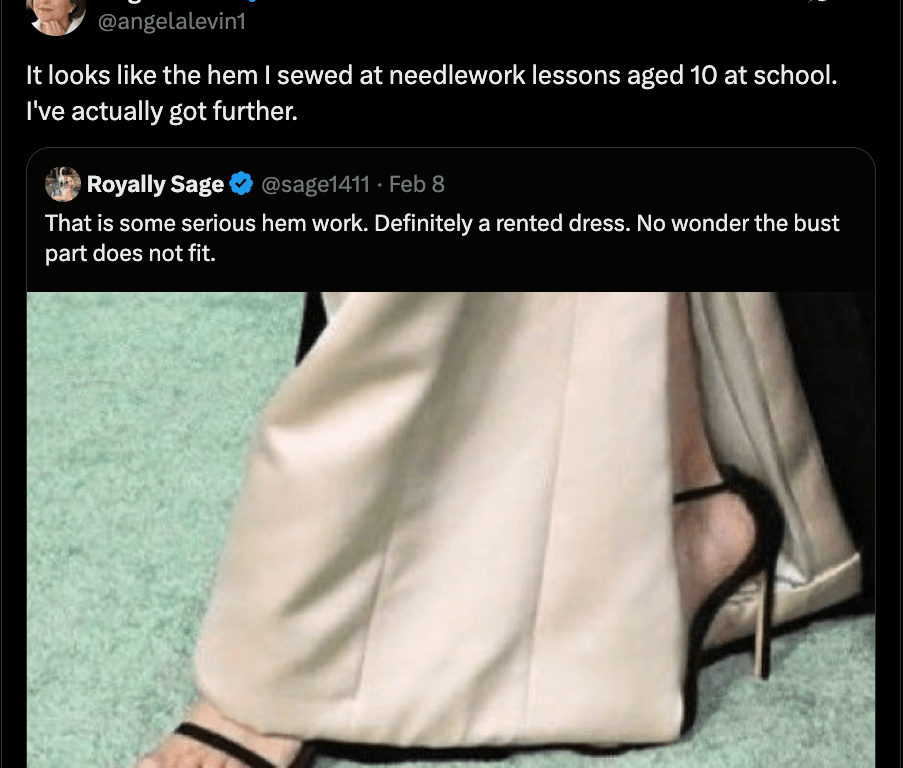 That’s the takeaway from her latest contribution to British public discourse, a quote tweet zooming in on the hemline of a gown at a green carpet event, declaring it inferior to her childhood needlework. “It looks like the hem I sewed at needlework lessons aged 10 at school,” she wrote. “I’ve actually got further.”