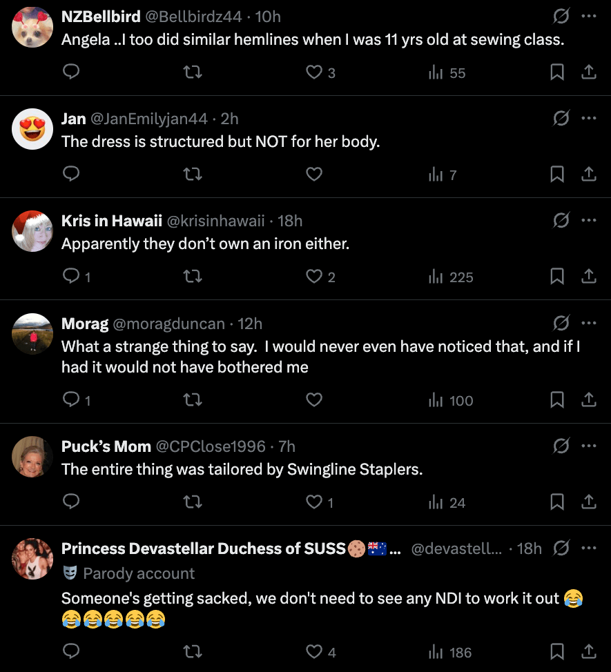 Let that sit for a moment. A biographer. A journalist. A woman with a verified account and a platform reaching tens of thousands. And this is what she chose to do with her Sunday evening: inspect fabric at someone’s ankles and announce that her prepubescent self could have done better.