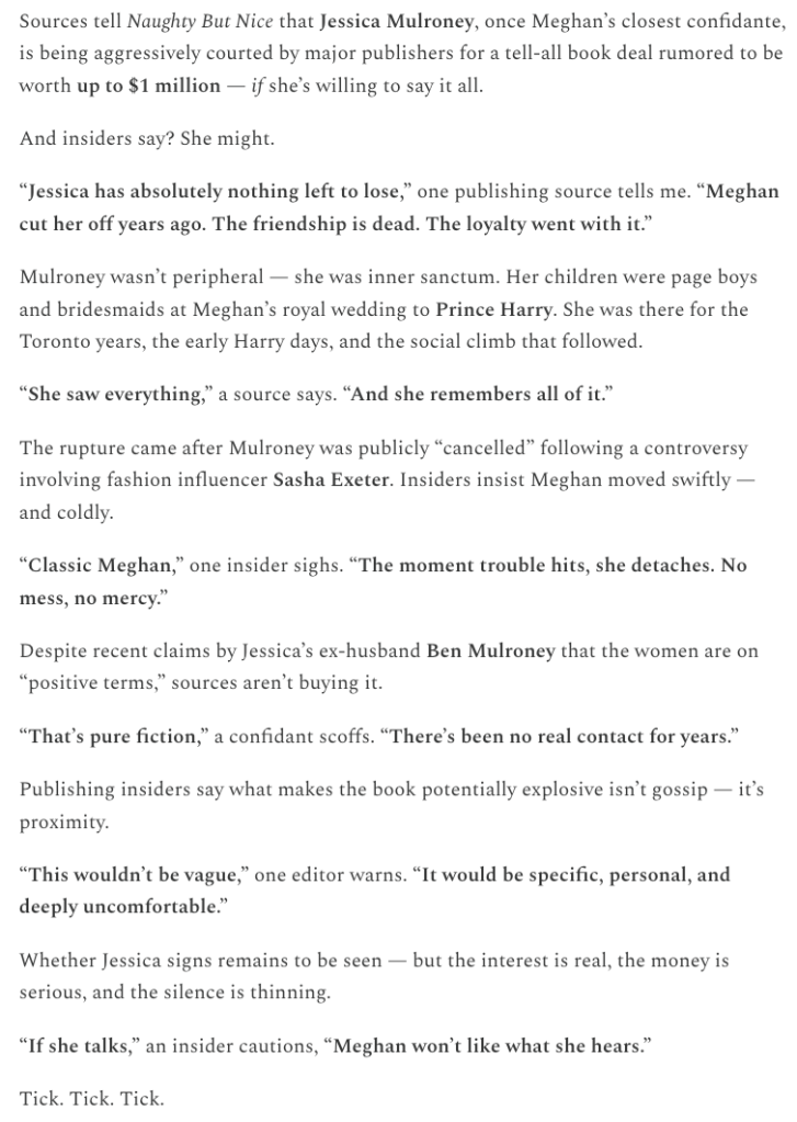 Or so you’d think. On February 9, 2026, Rob Shuter’s “Naughty But Nice” Substack ran what is presented as an exclusive: “Meghan Markle’s Former Best Friend Offered $1 Million to Tell All in New Book Deal.” The post features the same dollar figure, the same anonymous sourcing structure, and (most revealingly) some of the same language. The September Mirror piece quoted a source saying Mulroney “knows where the bodies are buried.” Shuter’s February post has a source saying “she saw everything” and “she remembers all of it.” The narrative DNA is identical. This is the same story, repackaged as new.