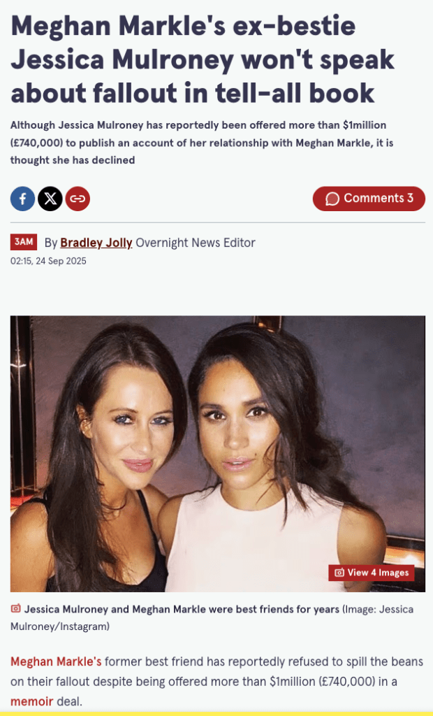 In September 2025, the Daily Mirror reported that Mulroney had been offered over $1 million for a memoir about her friendship with Meghan, and had declined. The article stated clearly that she told reporters she would “never” spill the beans, and that sources described her as wary of behavior that “could be perceived as being petty and bitter.”
