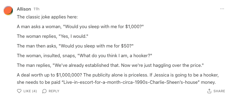 By reporting and re-reporting the offer, and by amplifying it across outlets with comment sections full of people begging Mulroney to accept, the media is conducting a sustained public pressure campaign on a woman who already said no. Shuter’s comment section is explicit: “Do it, Jessica!” “Do it for the world.” “Where do I preorder?” The message to Mulroney is unmistakable: there is money, fame, and an army of supporters waiting.
