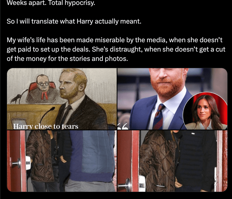 None of these people are engaging with Harry’s actual legal case, which predates his relationship with Meghan and concerns press intrusion into his private life. The thread is not a response to the case. It is a ritual, performed on schedule, reinforcing a set of conclusions that were reached long before any of the facts under discussion took place.