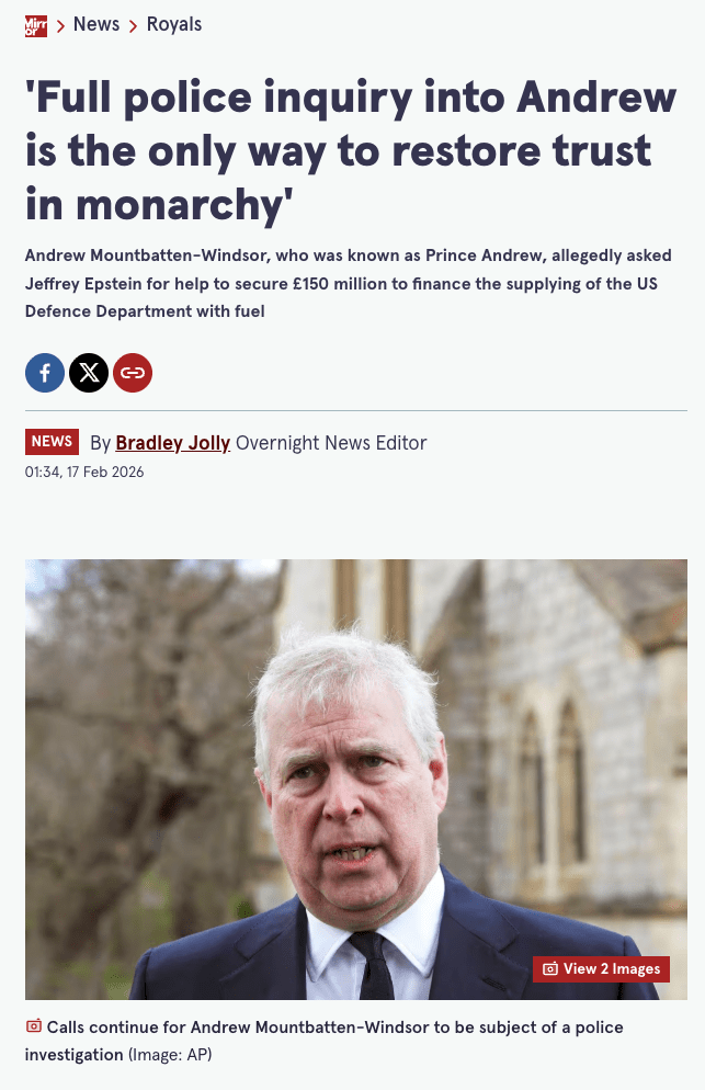 In the early hours of February 17, at 1:34 AM, the Daily Mirror published a story. It was not written by the royal editor. It was not flagged as an exclusive. It was filed by the overnight news editor, Bradley Jolly, and slotted into the news feed while most of Britain was asleep.