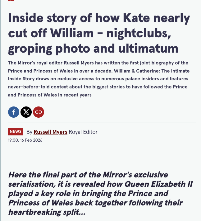 The final installment of Russell Myers’ serialization of William & Catherine: The Intimate Inside Story contains a photograph’s worth of trouble and a biography’s worth of cleanup. The trouble: in 2007, Prince William was photographed in a Bournemouth nightclub, sweaty, clutching a beer, appearing to grope an 18-year-old Brazilian student on the dancefloor while his girlfriend of four years sat at home. The cleanup: nearly 2,000 words of narrative scaffolding designed to transform that moment from what it looks like into something nobler.