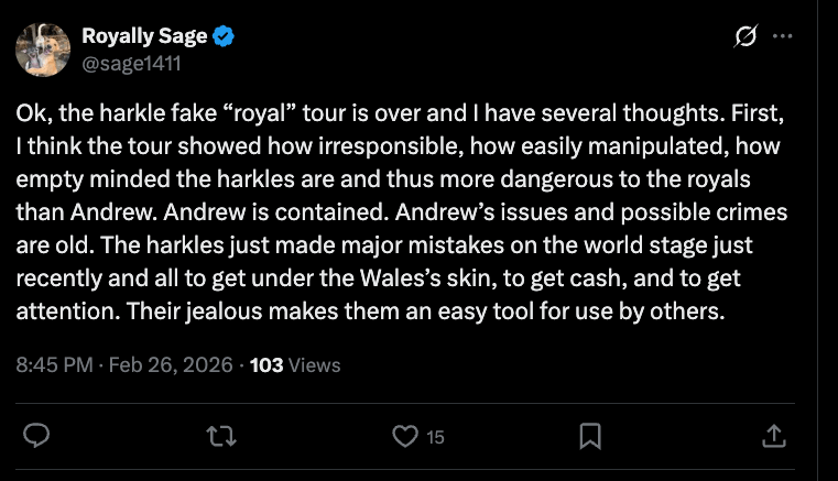 Read our other post on the abovr tweet from the same account. The tweet posted on the evening of February 26, 2026 by a verified account with a significant following in royal commentary circles, follow a structure precisely. The first three sentences establish the frame: the Jordan trip was fake, the Sussexes are irresponsible, empty-minded, and easily manipulated. The final sentence is where the real work happens.