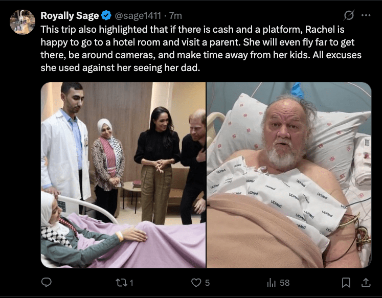 Instead, the comment is about Meghan’s father. A man whose relationship with his daughter became a tabloid fixture largely through his own press interviews and staged photographs. A man whose side of the estrangement has received extensive, sympathetic coverage in the same outlets that cover Meghan negatively. A private family situation that is known to the public almost entirely through one party’s media access.