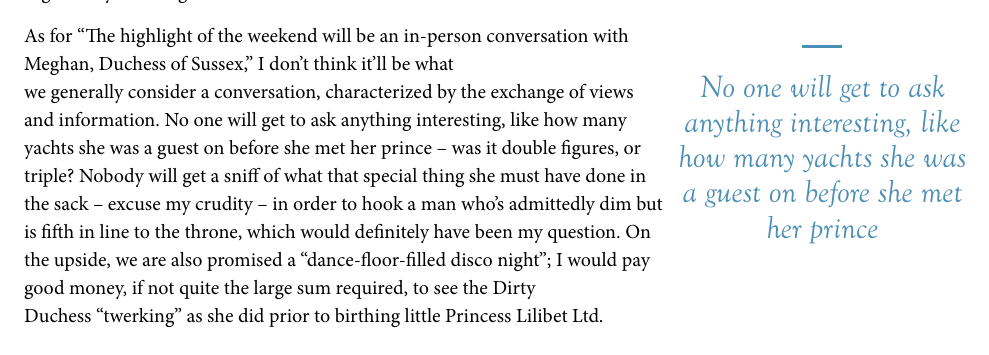 Burchill speculates about how many yachts Meghan was “a guest on” before meeting Harry, and asks whether the number was “double figures, or triple.” The yacht insinuation is a longstanding smear with racialized overtones that has followed Meghan since before her engagement. It implies sex work. The question mark provides the deniability.
