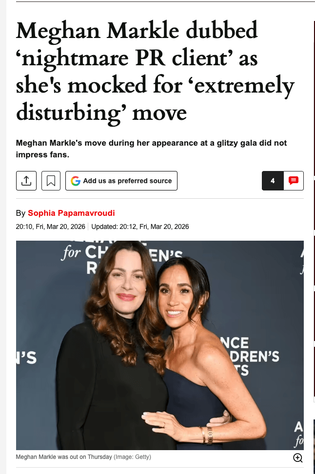 The second piece is headlined “Meghan Markle dubbed ‘nightmare PR client’ as she’s mocked for ‘extremely disturbing’ move.” The “extremely disturbing move” is that Meghan touched her pregnant friend’s belly at a charity gala.