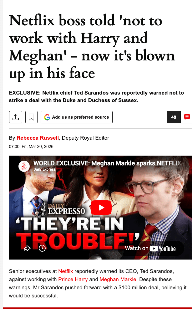 The Express also ran a piece the same day about Netflix executives reportedly warning CEO Ted Sarandos against working with the Sussexes. That article’s sourcing chain runs: anonymous sources to Variety, reinterpreted by a podcast host on the Daily Expresso show, aggregated by the Express, with additional anonymous Daily Mail sourcing layered in. Each link in the chain adds editorial heat while subtracting sourcing rigor.