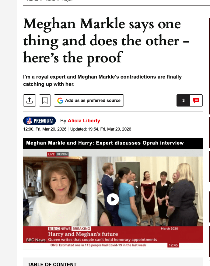 The third Express piece of the day is the most instructive because it operates at a higher register. Bylined by a self-described “royal expert” under the headline “Meghan Markle says one thing and does the other,” it presents itself as thoughtful cultural criticism rather than tabloid aggregation. It has sections with headers. It uses analytical language. It reads like a considered essay.