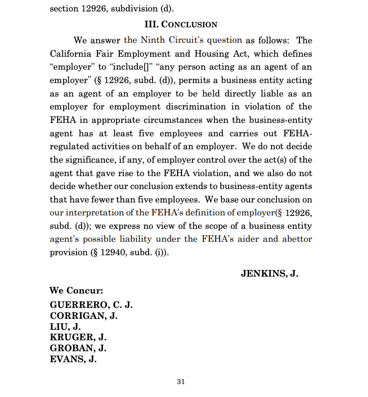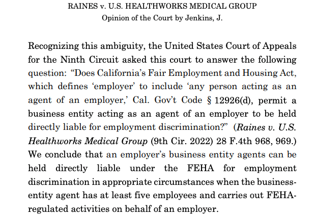 In Raines, the California Supreme Court addressed a medical screening company that conducted preemployment health questionnaires on behalf of prospective employers. That is a classic employer gatekeeping function delegated to a third party. Justice Jenkins grounded the holding in federal precedents where courts imposed agent liability on entities exercising “functions traditionally exercised by an employer”: hiring, firing, screening applicants, administering benefits, making personnel decisions. The court emphasized that the Raines defendant, U.S. Healthworks, was “the nation’s and California’s largest providers of occupational health” and had been delegated “employment decisionmaking authority.”