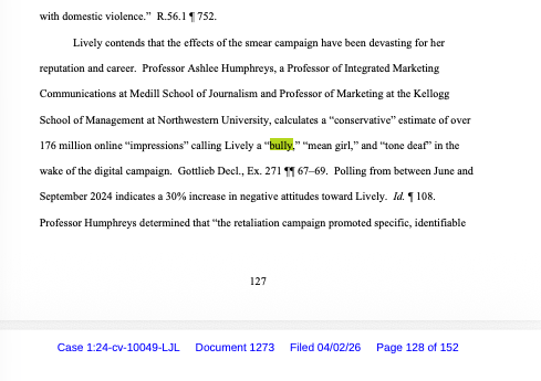 Case described the digital services as work executed “without fingerprints,” including “starting threads with theories the team approves of.” TAG communicated with approximately twenty media outlets about Lively. TAG pitched specific negative story angles to Daily Mail reporters. TAG coordinated with content creators including Sage Steele, providing talking points and reviewing draft scripts before publication. Professor Culotta found statistically significant markers of content manipulation on posts the Wayfarer Parties internally discussed. Professor Humphreys estimated over 176 million online impressions calling Lively a “bully” and “mean girl.”
