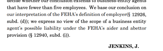 TAG’s brief quotes Raines three times. It quotes the “FEHA-regulated activities” holding. It quotes the “necessary minimum” language. It quotes the “engagement in FEHA-regulated activities on the employer’s behalf” formulation. But it does not quote the reservation of the aiding-and-abetting question. For a motion that depends entirely on collapsing aiding-and-abetting liability into the direct-liability framework, the omission of the sentence in which the California Supreme Court declined to do exactly that is a notable gap.