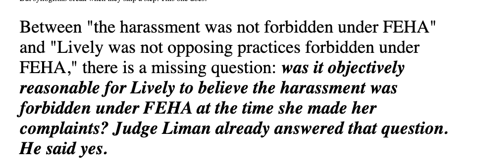 Premise two: The court has ruled that the harassment Lively complained about was not “forbidden under” FEHA because it occurred in New Jersey and FEHA does not apply extraterritorially. This comes from Judge Liman’s own opinion.