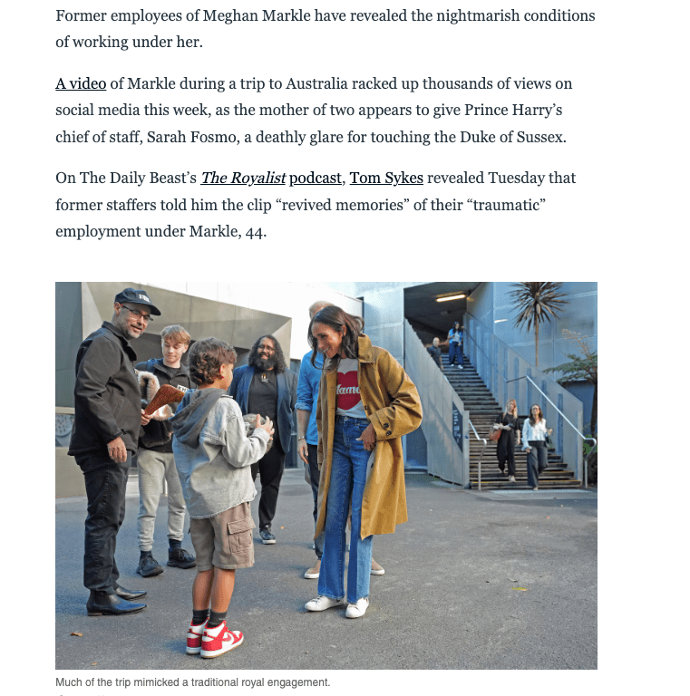 The reporting by The Daily Beast on Meghan Markle follows a familiar pattern: an ambiguous video moment is framed as meaningful, then reinforced through anonymous commentary. The underlying issue is that the visual itself is indeterminate, yet it is treated as evidentiary. This creates a narrative that feels substantiated without actually being verified. The “glare” becomes a conclusion rather than a question, and subsequent references to prior allegations are layered in to simulate continuity and credibility.