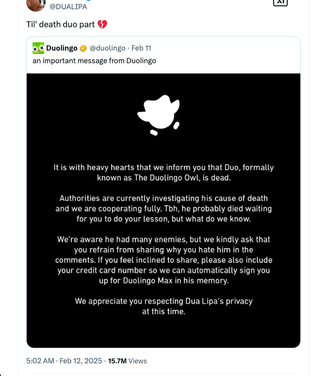 Duolingo, the language-learning app known for its engaging social media presence, has humorously crafted a narrative involving its mascot, Duo the Owl, harboring an affectionate “crush” on Dua Lipa. This playful storyline has been a recurring theme in Duolingo’s TikTok content, featuring videos where Duo expresses admiration for the singer. The culmination of this narrative occurred recently when Duolingo announced the fictional “death” of Duo, … Continue reading Dua Lipa: The Power of Digital Branding