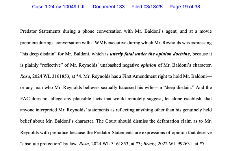 Ryan Reynolds’ recent reply supports his motion to dismiss the $400 million lawsuit by Justin Baldoni and Wayfarer Studios. He dismantles the claims, emphasizing the lack of specific statements, damages, and proximate cause. His arguments highlight that suing over hurt feelings lacks legal validity, ultimately seeking attorney fees under New York’s anti-SLAPP statute. Continue reading Ryan Reynolds’ Motion to Dismiss Reply