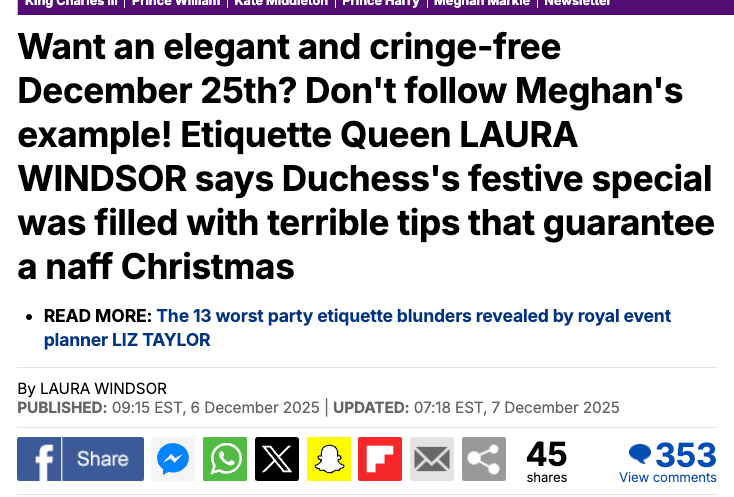The Daily Mail’s critique of Meghan’s holiday special misuses etiquette as a proxy for an aesthetic and class-based judgment. It equates informality with a lack of elegance, framing personal expressions and decor choices as failures of hosting. This critique, inherently subjective, turns cultural differences in style into moral shortcomings, undermining the true essence of etiquette. Continue reading Why the “Etiquette” Critique of Meghan’s Holiday Special Misses the Point